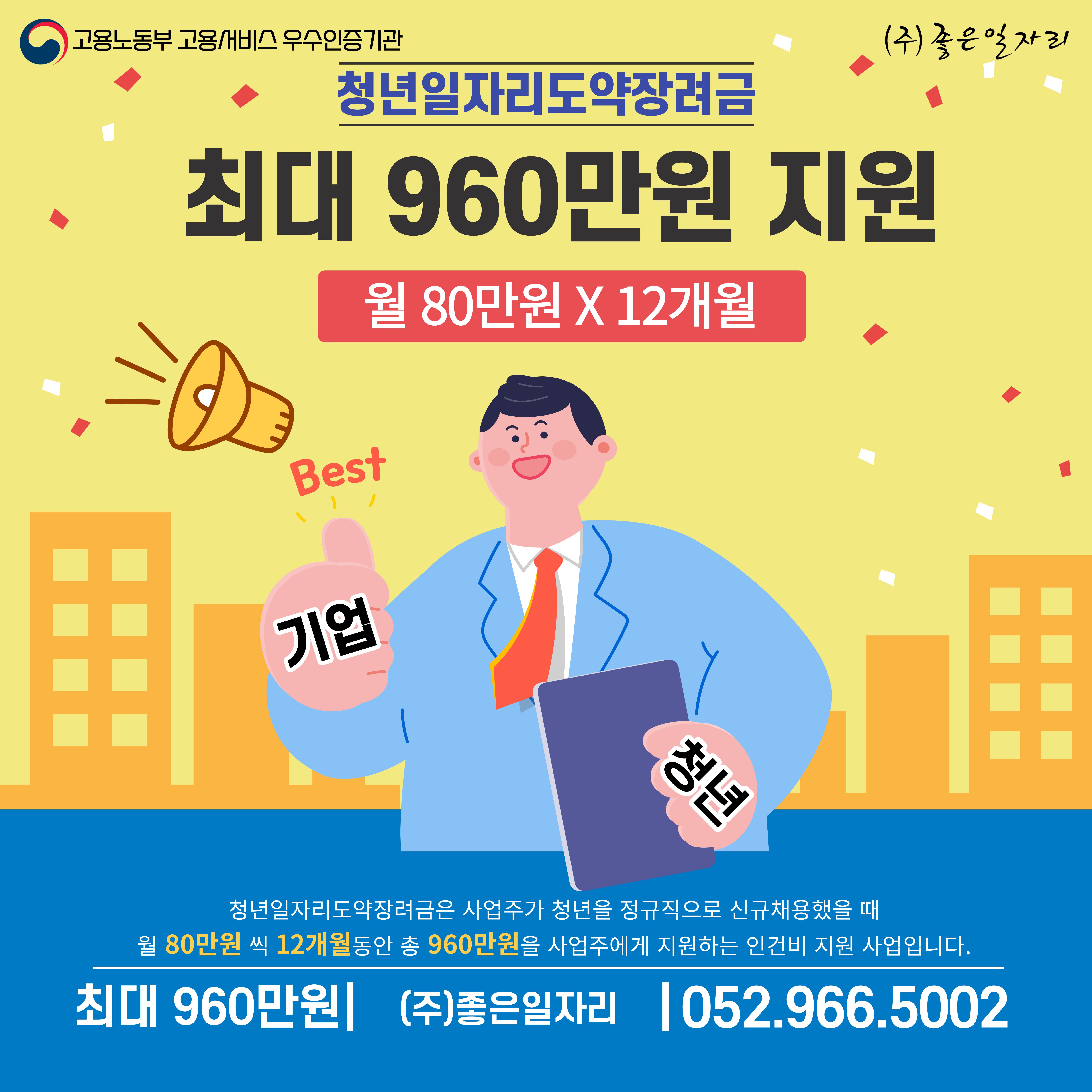 기업에게도 청년에게도 좋은 '청년일자리도약장려금'청년 일자리 창출을 지원하기 위해 5인 이상 중소기업 등에서 취업 애로 청년을 정규직으로 채용 후 6개월 이상 고용유지 시•1인당 월80만원씩, 최대 12개월간 960만원 지급•✅상담신청ulsan1.co.kr>청년일자리도약장려금>상담신청✅문의처052)966-5002