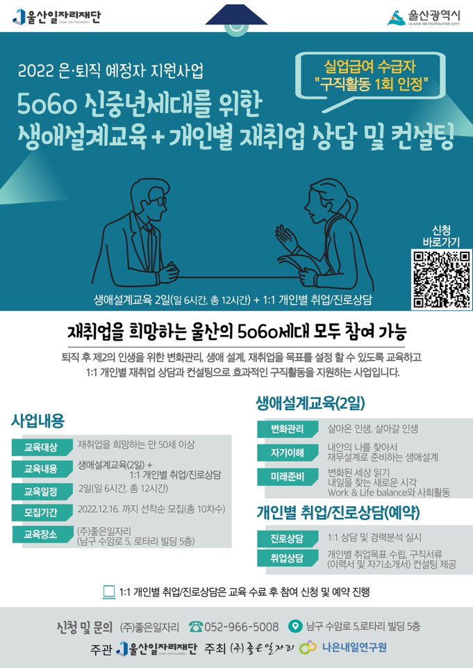 [무료교육] 2022 은퇴직 예정자 교육 지원사업(+재취업컨설팅)