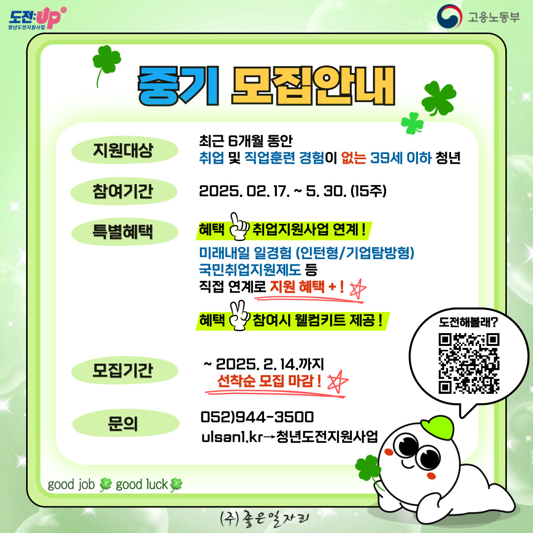 ✅ 신청방법: 고용24(www.work24.go.kr) - '청년도전지원사업'검색 - 신청 - 로그인 - 울산남구 (주)좋은일자리 선택!